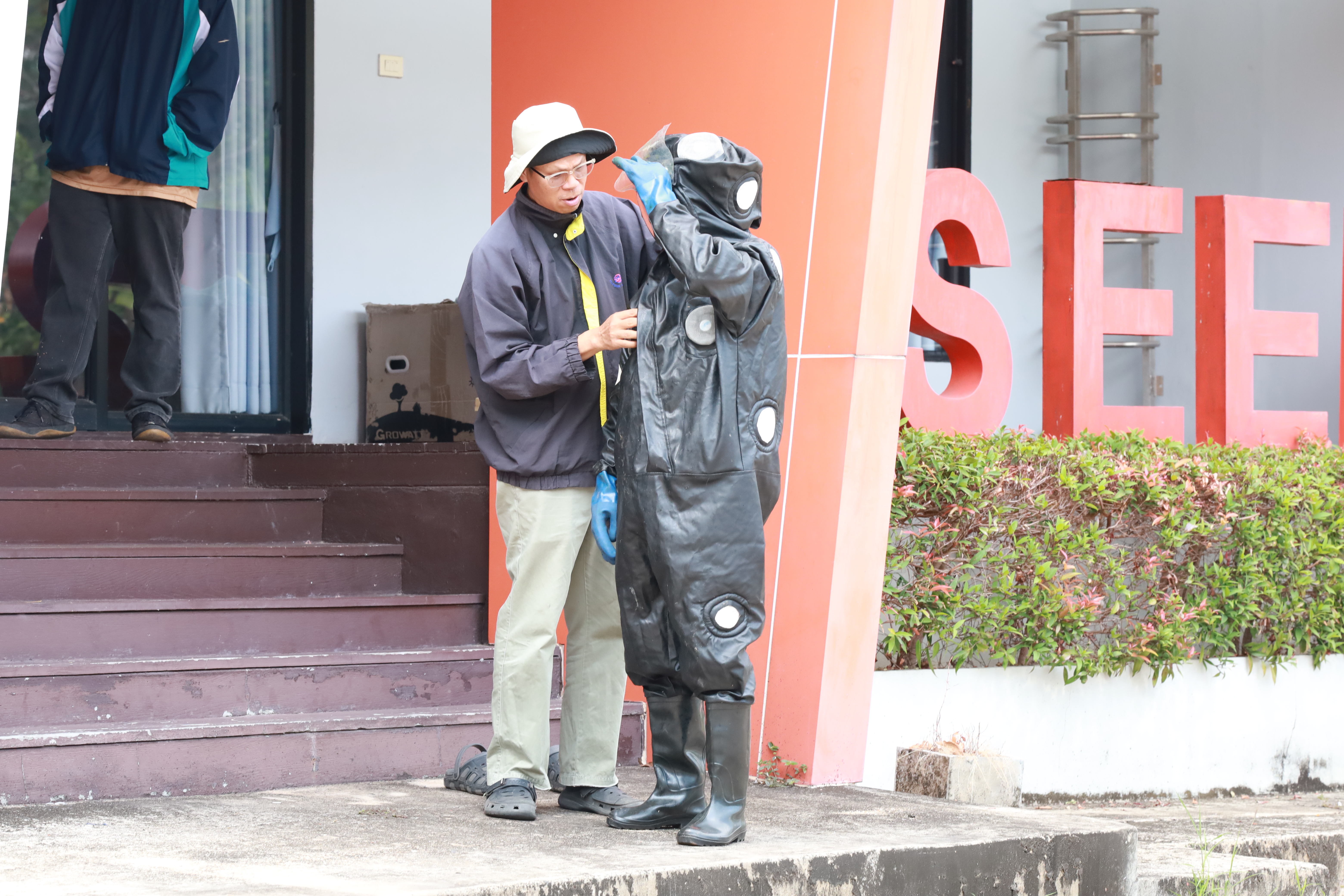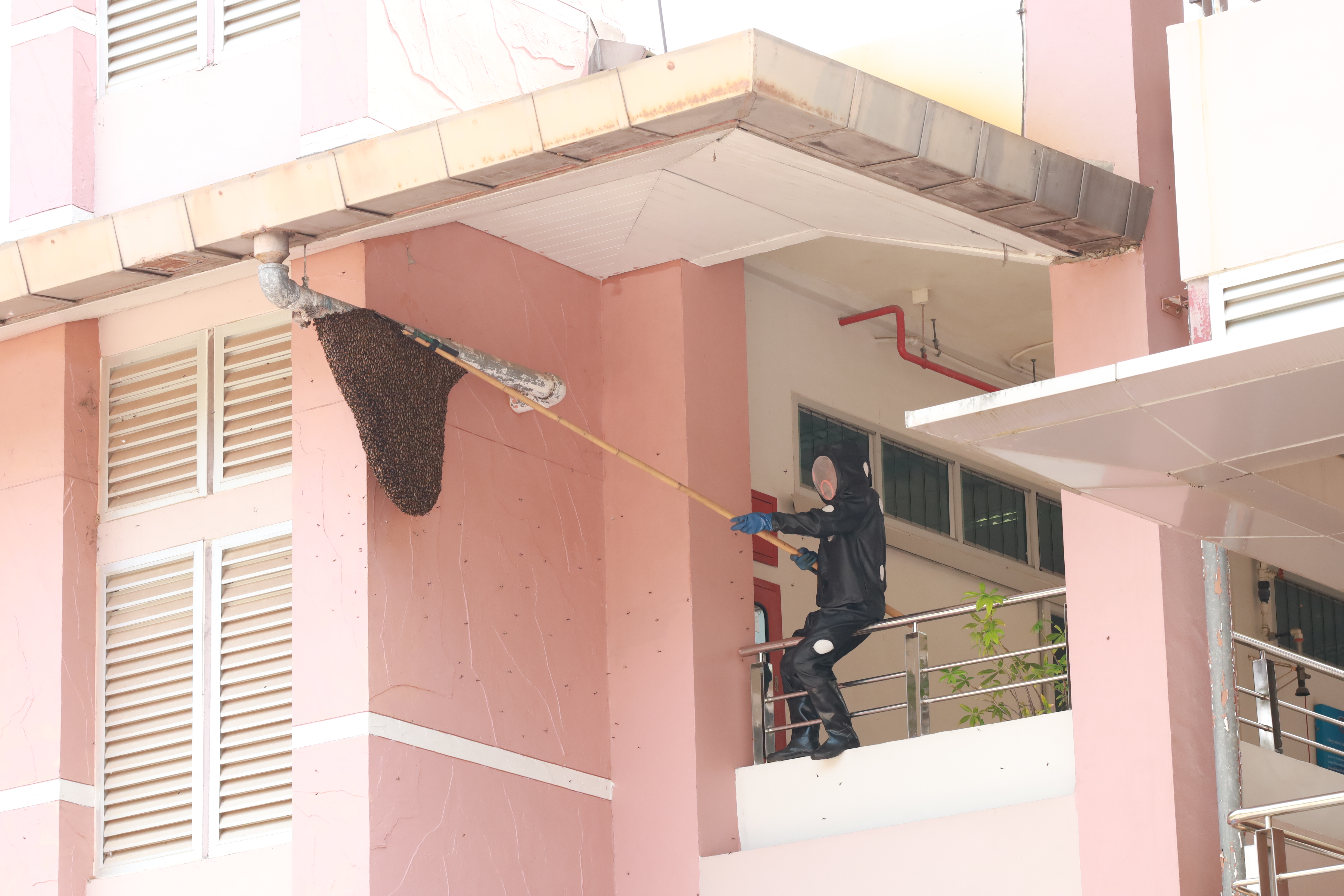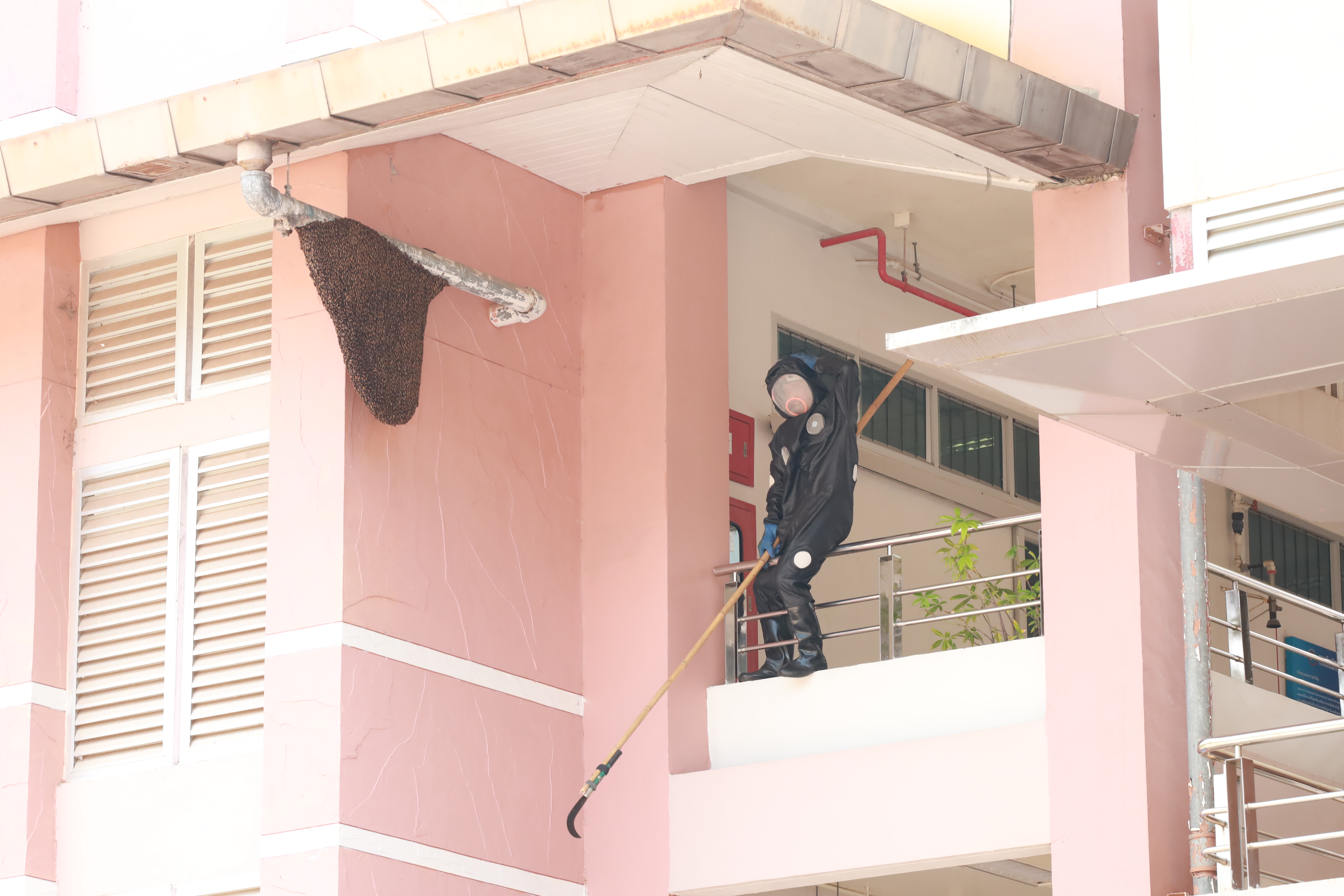 ในการปฏิบัติงาน เจ้าหน้าที่ได้สวมใส่ชุดป้องกันผึ้งอย่างเหมาะสม เพื่อป้องกันอันตรายที่อาจเกิดขึ้นระหว่างการดำเนินงาน เนื่องจากบริเวณดังกล่าวเป็นจุดที่ผึ้งทำรังอยู่บริเวณคานหลังคา ซึ่งมีความเสี่ยงสูงในการเข้าถึงและดำเนินการ