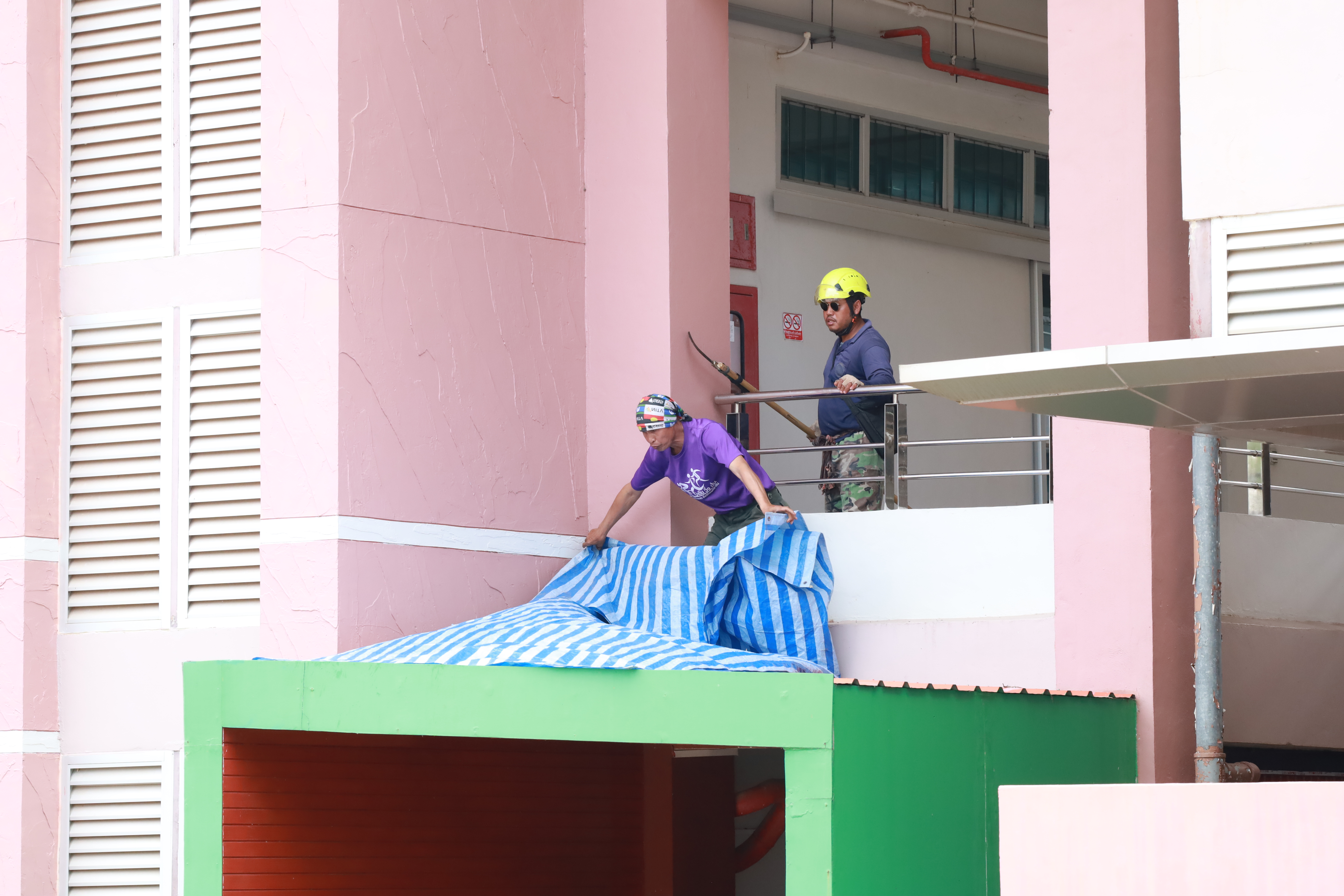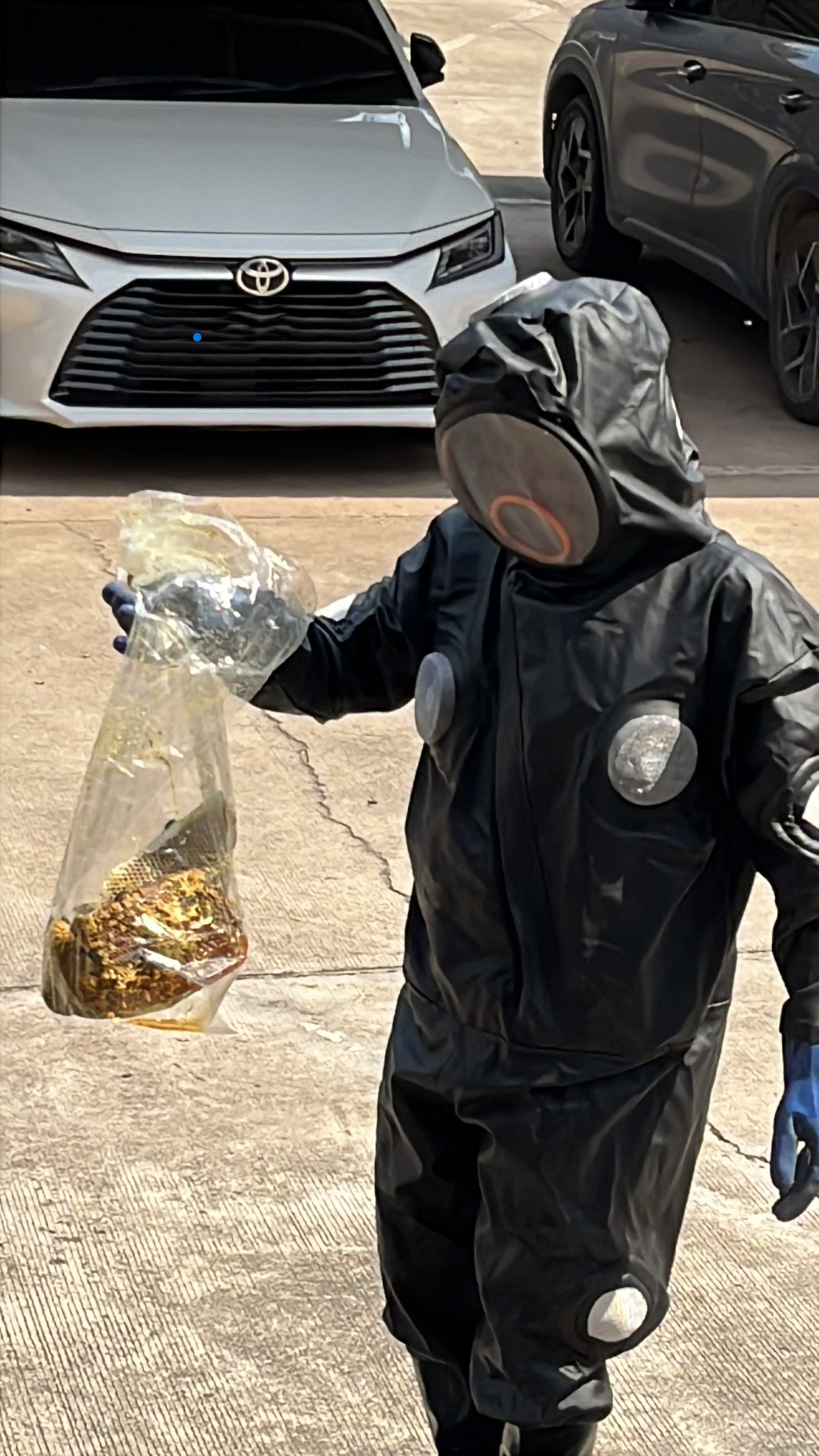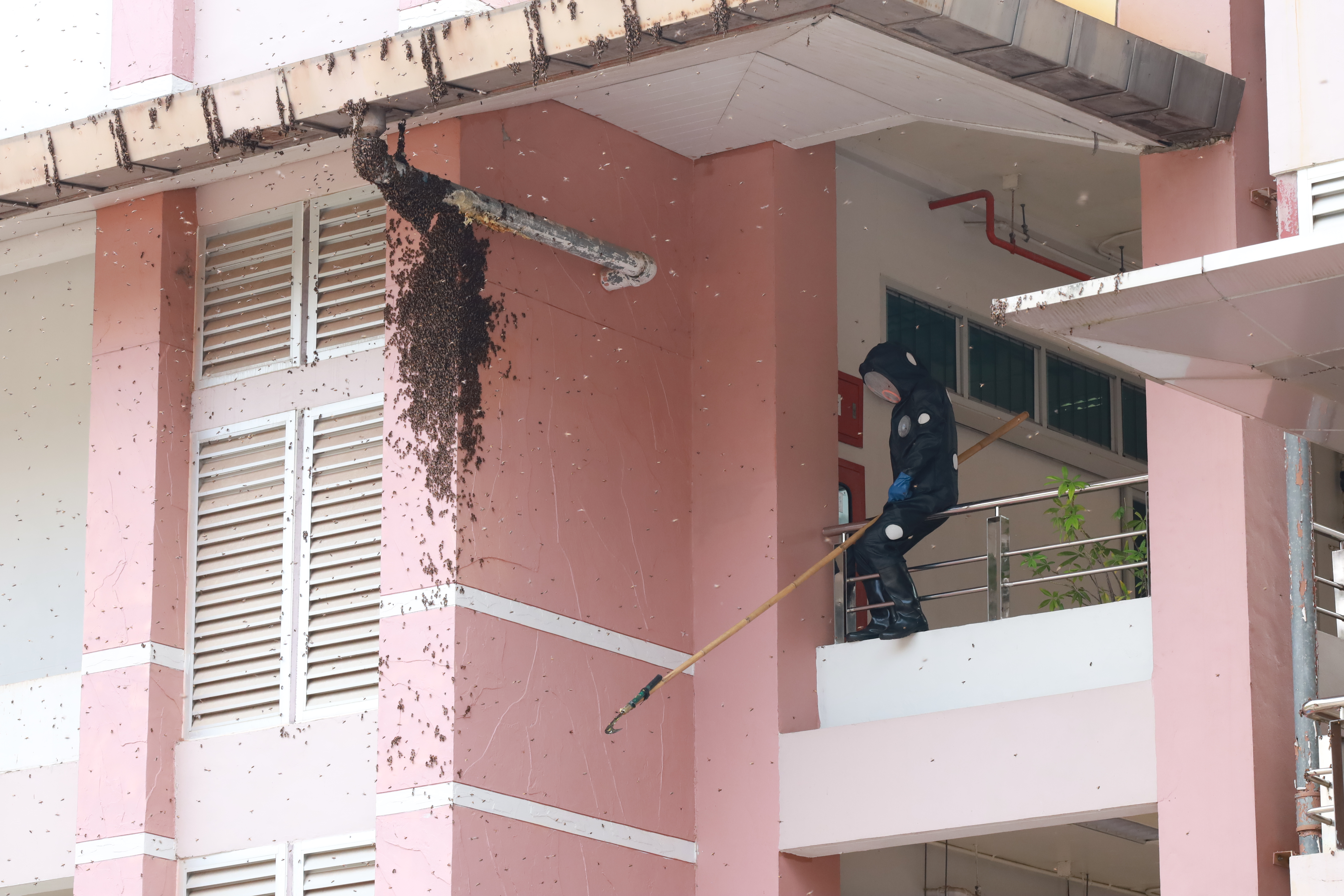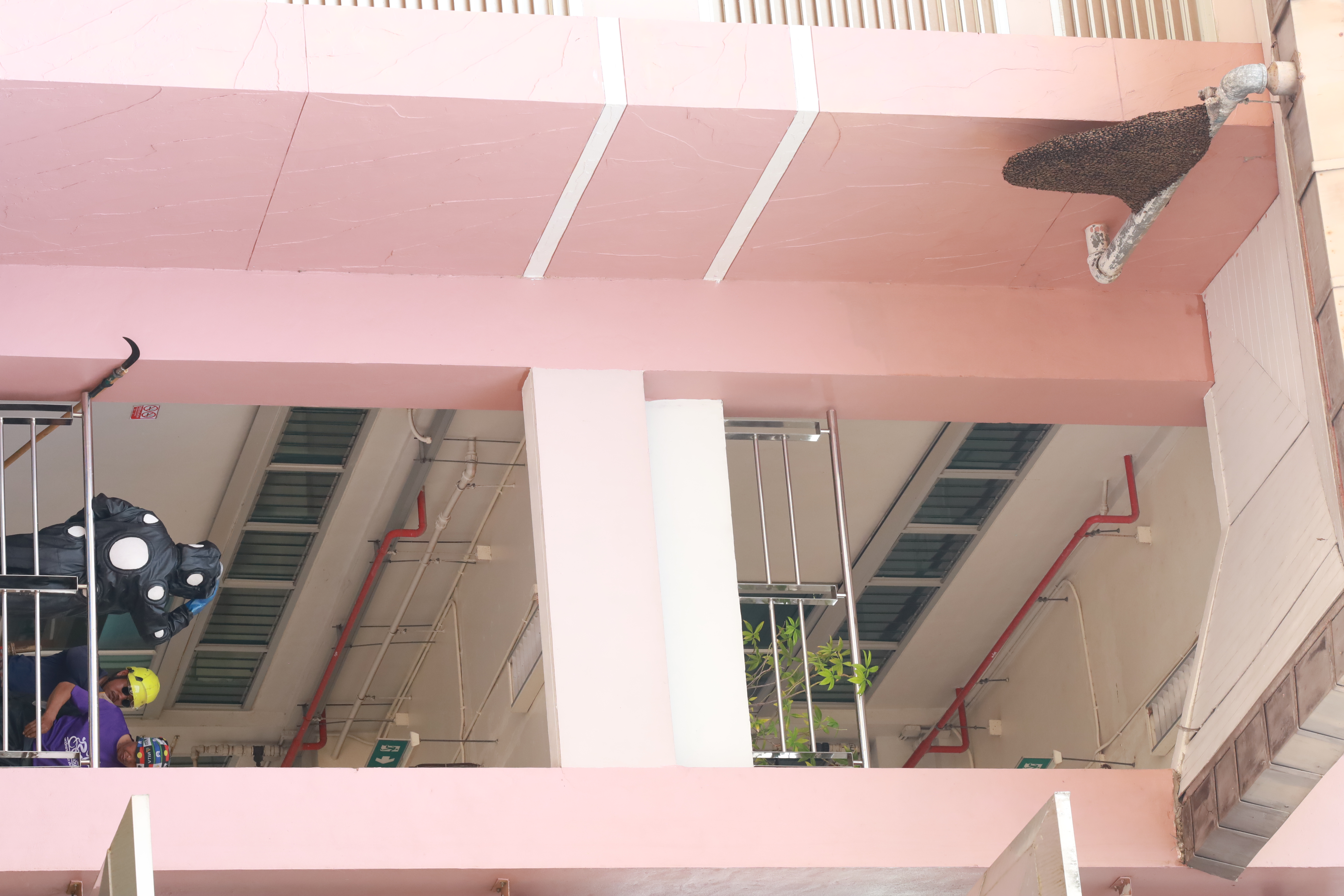 ในการปฏิบัติงาน เจ้าหน้าที่ได้สวมใส่ชุดป้องกันผึ้งอย่างเหมาะสม เพื่อป้องกันอันตรายที่อาจเกิดขึ้นระหว่างการดำเนินงาน เนื่องจากบริเวณดังกล่าวเป็นจุดที่ผึ้งทำรังอยู่บริเวณคานหลังคา ซึ่งมีความเสี่ยงสูงในการเข้าถึงและดำเนินการ