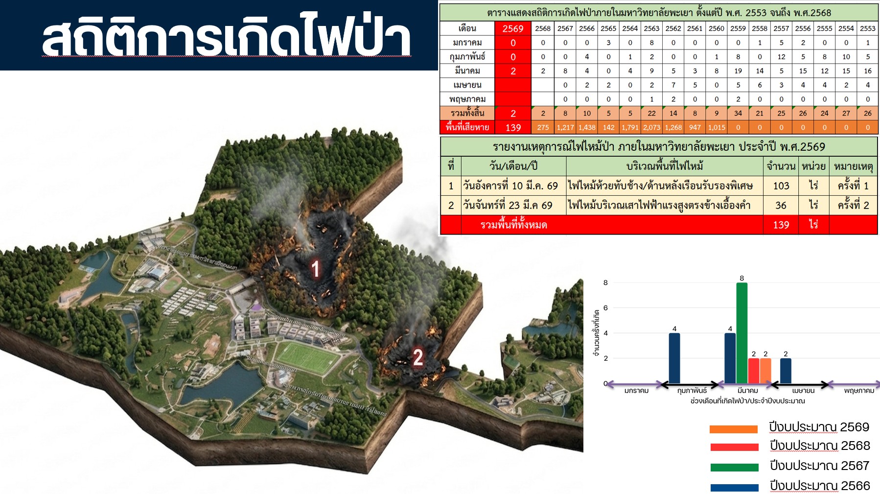 เมื่อวันจันทร์ที่ 23 มีนาคม พ.ศ. 2569 เวลา 08.40 น. งานความปลอดภัย กองอาคารสถานที่ มหาวิทยาลัยพะเยา ได้รับแจ้งเหตุไฟไหม้บริเวณตรงข้ามเรือนเอื้องคำ มหาวิทยาลัยพะเยา ใกล้เสาไฟฟ้าแรงสูงต้นที่ 3
